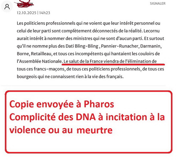 Dans mon signalement aux DNA j'avais mis ceci >>> La Loi dit que >>> L'incitation à l'élimination des franc-maçons est un crime en droit français, puni par les lois sur la liberté de la presse, la provocation à la haine et la violence. Cela inclut toute menace de mort, de violence ou de discrimination fondée sur l'appartenance maçonnique.